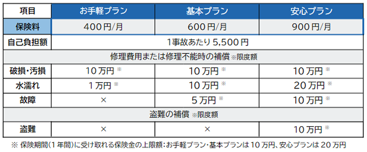 「お手軽プラン」(月額400円)、「基本プラン」(月額600円)、「安心プラン」(月額900円)の3種類